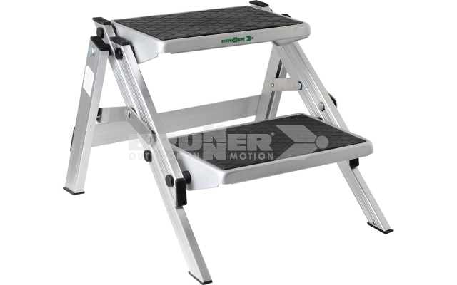 Marchepied double pour caravane et camping-car. Construction pliante en aluminium, légère et robuste. Avec surface antidérapante. Facile à transporter et à ranger.