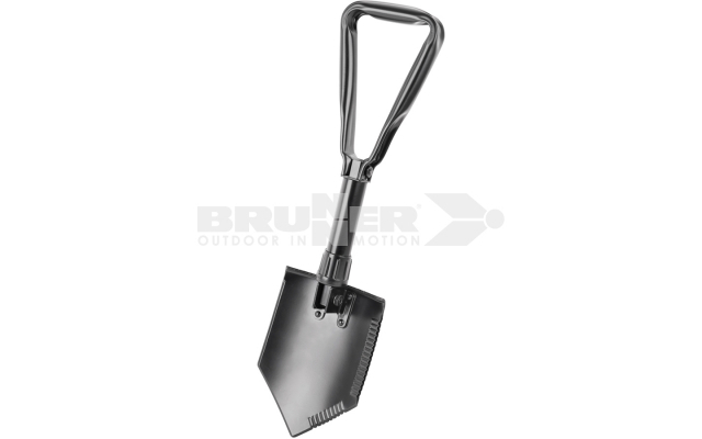 Pelle / houe pliante en métal forgé. Lame dentelée et manche tubulaire qui se resserre au moyen d'une broche intégrée. Complet avec housse de rangement.