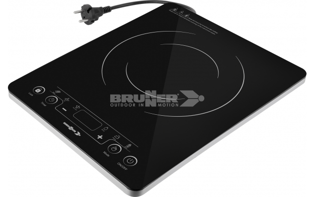 Plaque à induction portable en PP et surface de cuisson en vitrocéramique haute résistance. Parfait pour une utilisation en plein air et en camping grâce à son faible poids et à ses 9 niveaux de puissance (300 - 2000 W) sélectionnables via le commutateur Touch Control et l'affichage LED.