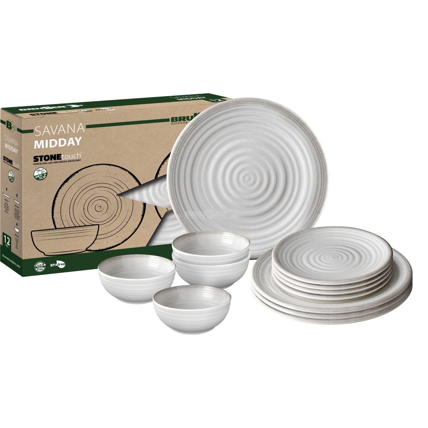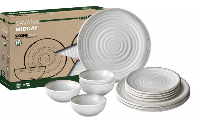 Set de vaisselle en mélamine de haute qualité (12 pièces). Toutes les pièces sont douées de système antiglisse.