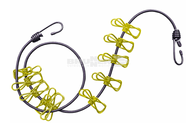 Corde à vêtements extensible avec 2 crochets de fixation aux extrémités et 12 clips métalliques. Longueur: 1,9 / 3,5 m.
