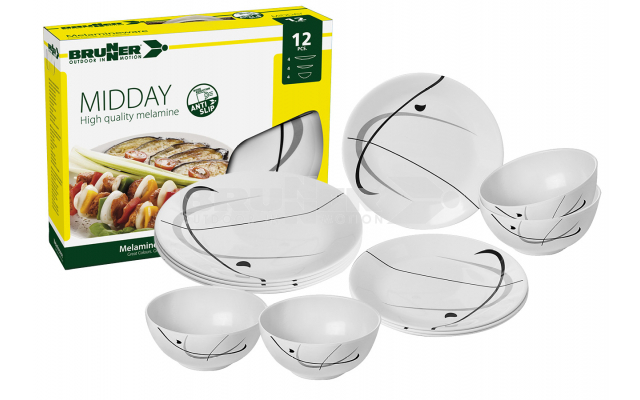 Set de vaisselle (12 pièces). Toutes les pièces sont dotées d’anneau antiglisse sur le fond.