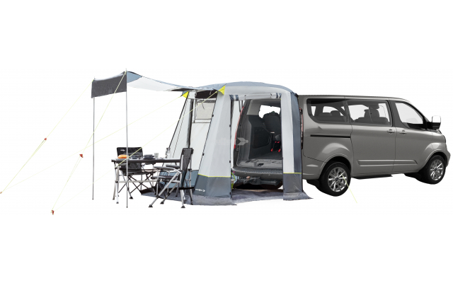 La tenda posteriore senza telaio Foyer è stata progettata per essere fissata senza soluzione di continuità al portellone posteriore dei modelli Ford Transit Custom e Ford Tourneo Custom 2023 —>. Questa tenda eccezionalmente attrezzata amplia l'interno del veicolo, offrendo una comoda zona pranzo e di stivaggio. È fissata saldamente al portellone posteriore con robuste cinghie, mentre i lati sono ancorati al veicolo per proteggere efficacemente dalla pioggia. La parte inferiore della tenda è tesa contro l'auto, garantendo una perfetta aderenza. Un paraspruzzi esterno posizionato strategicamente facilita il drenaggio efficiente di grandi volumi d'acqua. La parete anteriore della tenda può essere arrotolata o configurata come tendalino parasole, offrendo versatilità per diverse condizioni atmosferiche. Per una circolazione ottimale dell'aria, due finestre in rete di generose dimensioni sono posizionate sul lato destro e sulla parete anteriore. Inoltre, le cinghie di tensionamento e i tiranti multipli migliorano la stabilità della tenda, garantendone la sicurezza in diversi ambienti esterni.